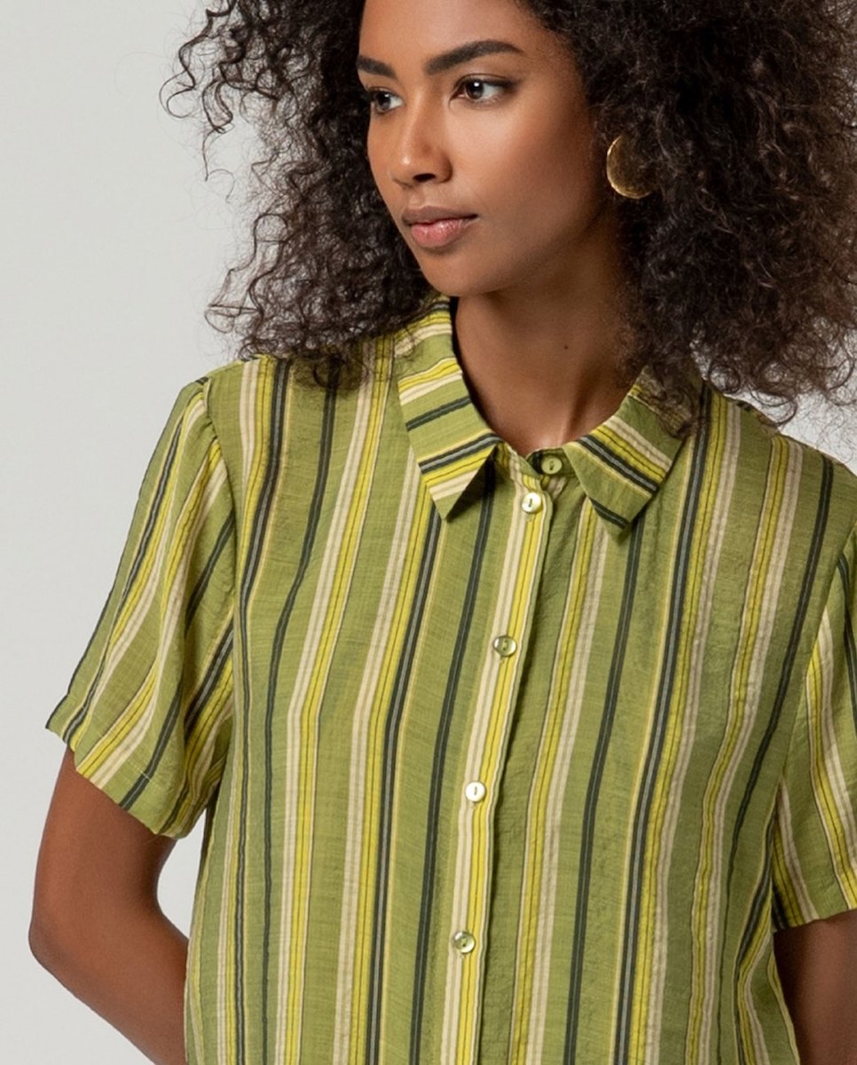 El cuello camisero y el cierre frontal con botones mantienen un aire clásico, actualizado con su manga corta y su caída ligera. El bajo recto con pequeñas aberturas laterales añade comodidad y facilita el movimiento.
