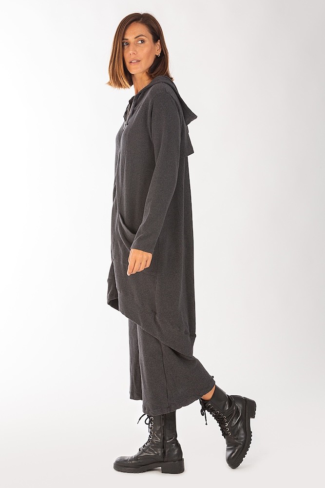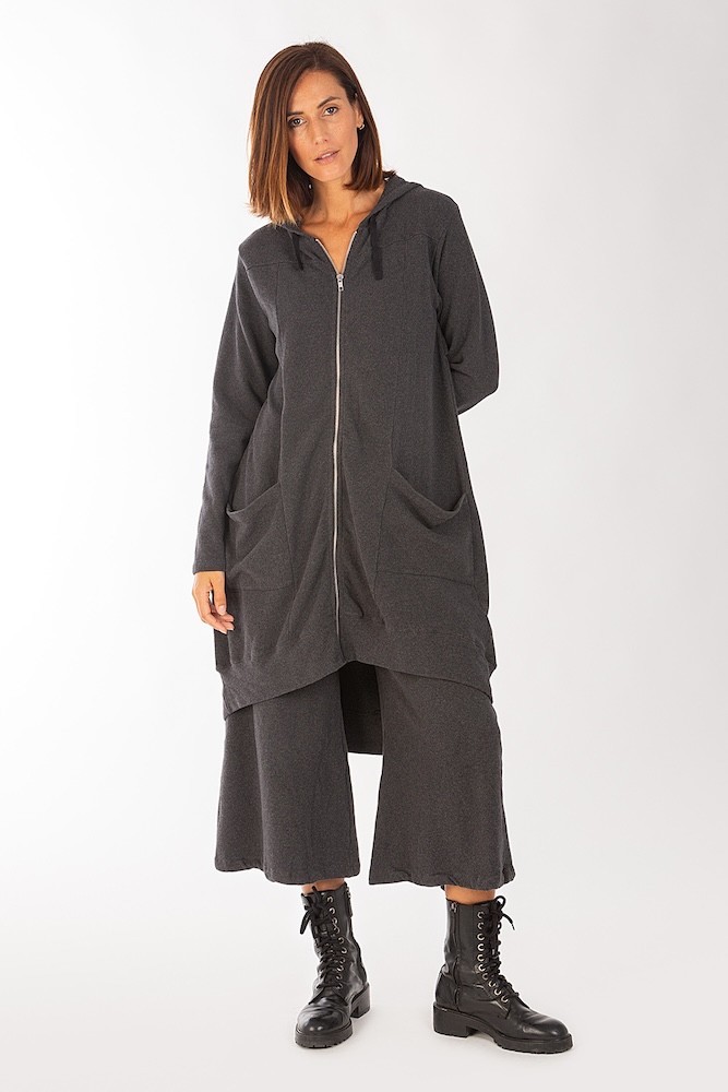 Esta chaqueta larga con capucha y cremallera es perfecta para abrigarse con estilo. Confeccionada con un tejido suave que ofrece confort y calidez, es ideal para combinar con el pantalón Slagger, creado con el mismo tejido. Diseñada y fabricada localmente en Barcelona, esta prenda refleja compromiso con la moda sostenible y la producción de proximidad.