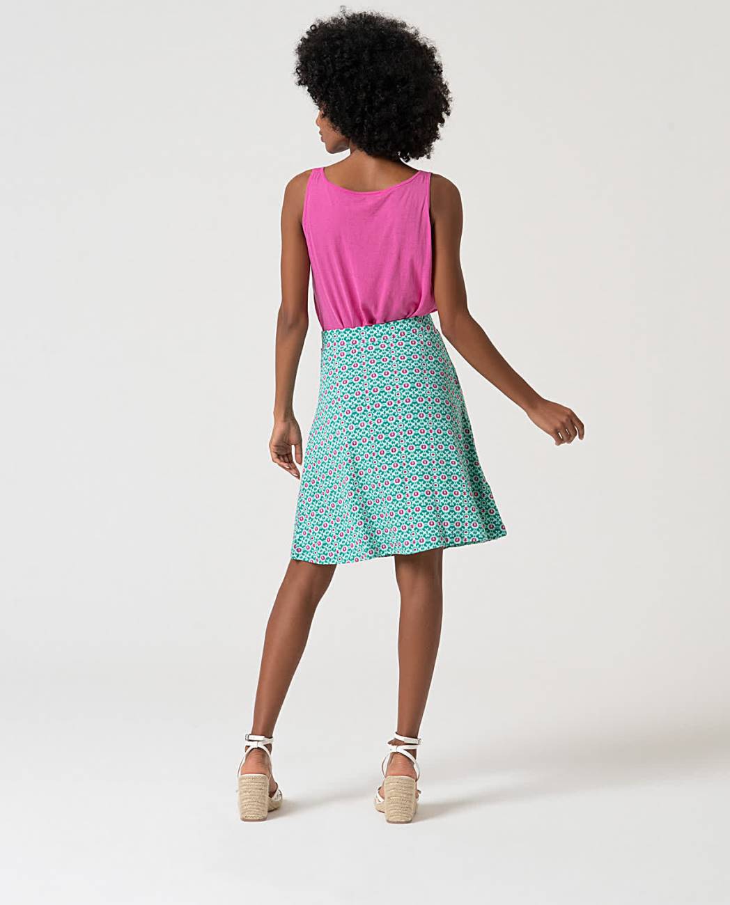 Fabricada en 95% Modal Aloe Vera y 5% Spandex, esta falda destaca por su tejido suave, transpirable y elástico, proporcionando libertad de movimiento y una sensación de frescura incomparable. El estampado en tonos turquesa la convierte en una opción ideal para looks casuales o combinaciones más sofisticadas.