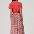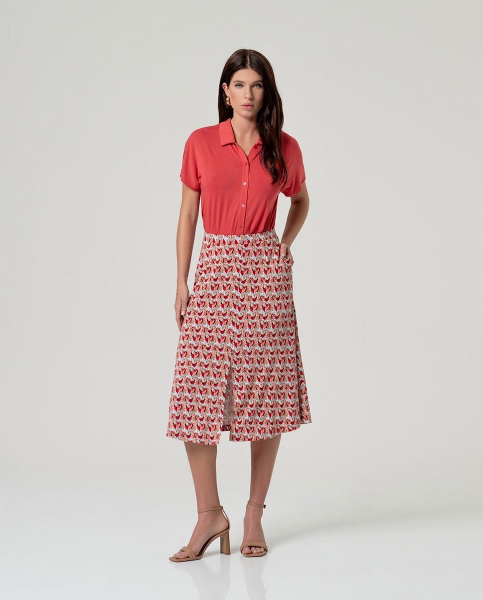 El corte recto se combina con un estampado geométrico continuo que añade dinamismo y originalidad, convirtiéndola en una pieza protagonista. Está confeccionada en un tejido ligero con viscosa EcoVero y elastano, lo que proporciona suavidad, caída fluida y comodidad durante todo el día.