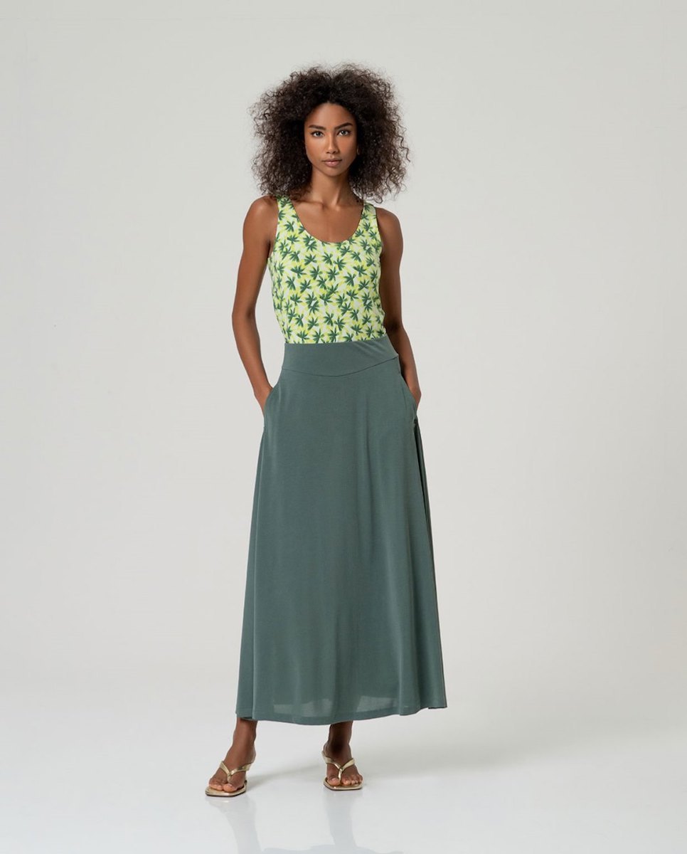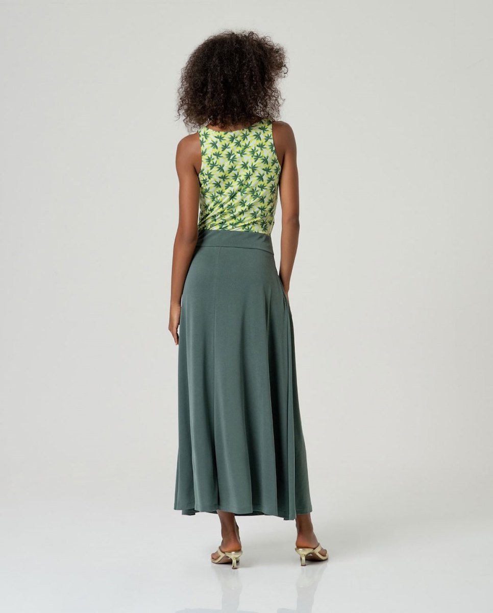 La maxi falda amplia de Surkana en verde botella es una prenda elegante y muy cómoda, ideal para crear looks fluidos y con movimiento. Su diseño de tiro alto estiliza la silueta, mientras que el corte evasé aporta ligereza y un efecto favorecedor al caminar.
