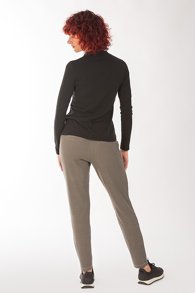 Pantalón de corte recto, bolsillos laterales, goma en la cintura.
